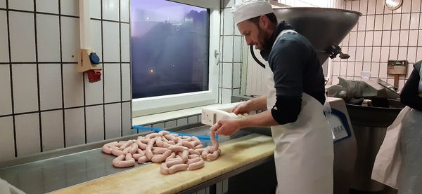 c) Brühen: Das Wasser muss 80 Grad heiß sein. In dieses Brühbad kommen die Würste 20 Minuten. Ein Gewicht sorgt dafür, dass alle UNTER Wasser sind.