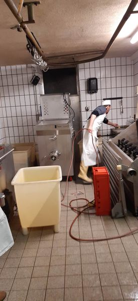 Schweine werden maximal 3 oder 4 Tage abgehängt nach dem Schlachten, während Rind 1 Woche hängen muss.